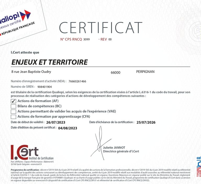 « Enjeux et Territoire » est un organisme certifié Qualiopi et agréé par le Ministère de l’Intérieur pour former les élu.es.
